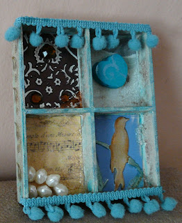 Maybe I'm finally getting used to the heat, or maybe it has cooled down a degree or two, but anyway, I managed to finish off the box that was languishing on my desk on Wednesday. I woke up yesterday with some ideas buzzing around and set to work dry brushing some Claudine Hellmuth Classic Teal over the Traditional Tan, then wiped it over with a wet baby wipe to fade it in to the background. I stuck some scraps of patterned paper into two of the squares and then spritzed the whole thing with some light blue mica and water in a mini mister. The other two squares were filled with some scraps of TSS metal run through a couple of cuttlebug embossing folders. The patterned one was just sanded off and stuck in, the bird one I coloured with some alcohol inks. I then coated the frame with rock candy crackle paint (because it was on my desk and the transparent croco had been put away). I also coated the PPs and a bit of the corners on the metal squares. it crackled, but I think I prefer the effect of the croco.. bigger cracks. Anyway, at that point I was dragged off by my DDs for a meal out. We went to a bar called Belgo (I think) which had the most sublime mussels I have ever tasted. Not only are they the biggest and juiciest mussels, but they do them in loads of different ways, not just the usual Mariniere (which I love BTW, but it's nice to have something different), all washed down with chilled Belgian beer. Wonderful!
